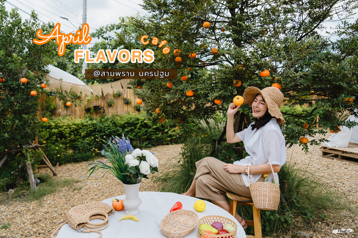 April Flavors Cafe คาเฟ่ในสวนส้ม หลังวัดสว่างอารมณ์ สามพราน ด้านในตกแต่งด้วยผ้าม่านบางๆ มินิมอล สไตล์เกาหลี มีที่นั่งหลายโซนทั้งโซน indoor และ outdoor ด้านข้างร้านมีมุมสวนส้มโดดเด่น ถ่ายรูปสวยได้ฟีลปิคนิคในสวน