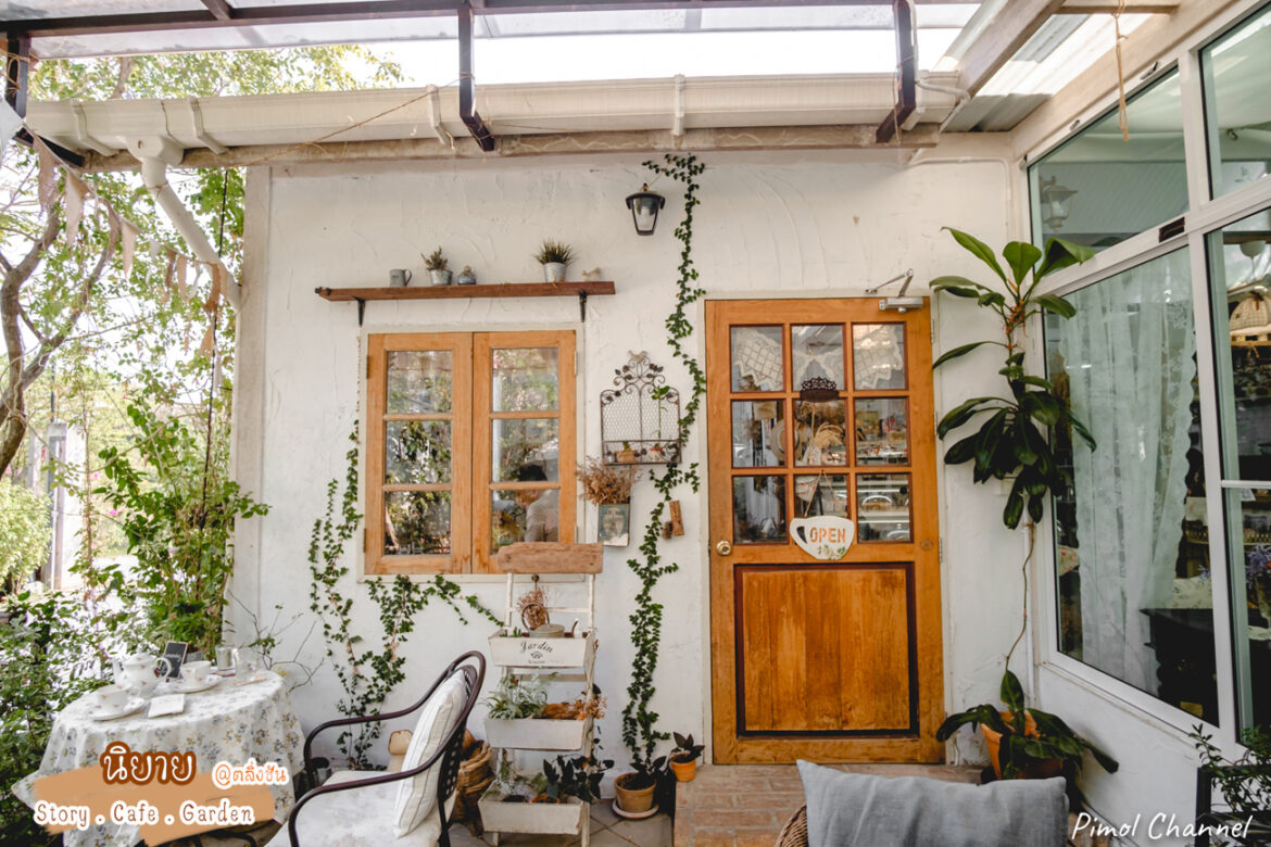 ร้านนิยายคาเฟ่ คาเฟ่น่ารักเหมือนในนิยาย ภายในร้านทาสีขาว ตกแต่งด้วยผ้าม่านลูกไม้ ผ้าปูโต๊ะลายดอกไม้เล็กๆสไตล์วินเทจ ประดับด้วยเฟอร์นิเจอร์ไม้ ให้ความรู้สึกอบอุ่น ด้านนอกร้าน โซนoutdoor ตกแต่งสวนสไตล์อังกฤษ มีที่นั่งกว้างขวาง บรรยากาศในร้าน ไม่ว่าจะถ่ายรูปมุมไหนก็น่ารักไปหมด ใครสายถ่ายรูปต้องไม่พลาดเลย
